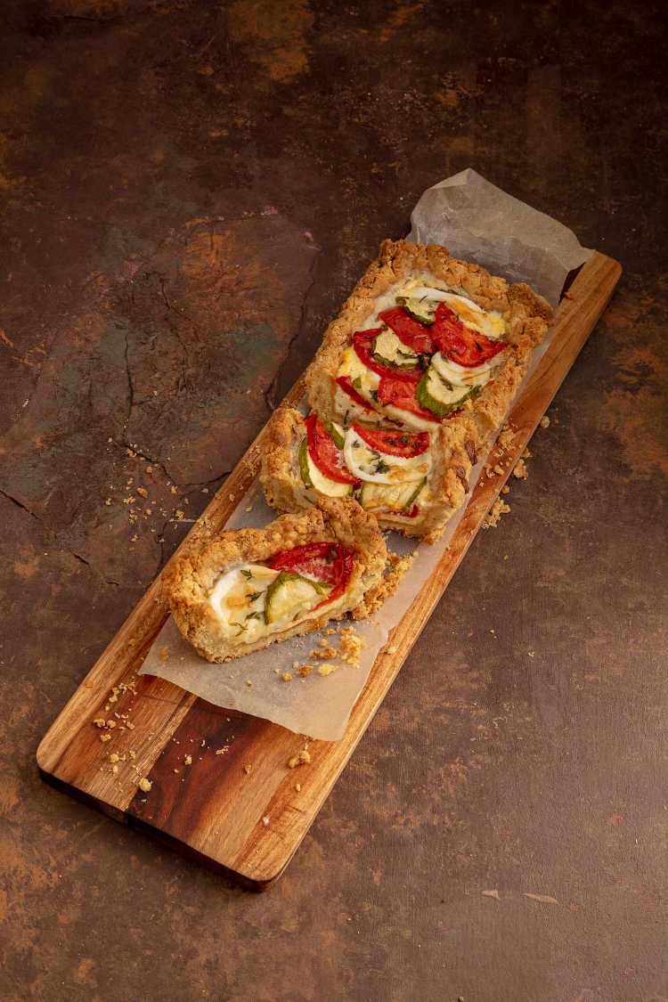Ardından fırında pişirdiğiniz domates, kabak ve dilimlediğiniz mozarella peynirini sıra sıra dizin.