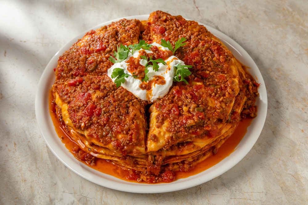 Diğer hamuru üzerine yerleştirin bu şekilde bir kat hamur bir kat kıyma olacak şekilde kat kat yerleştirin.