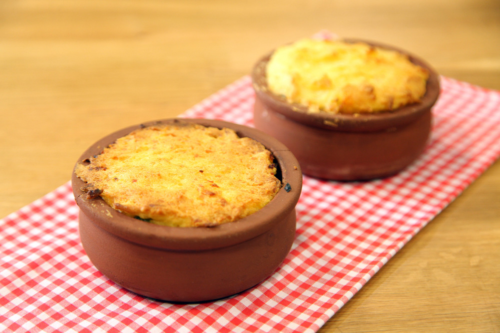 Pilavınızı güveç kaplarınıza alın. Üzerlerine patates pürenizi sürün ve 200 derecede üzerleri kızarıncaya kadar pişirin.