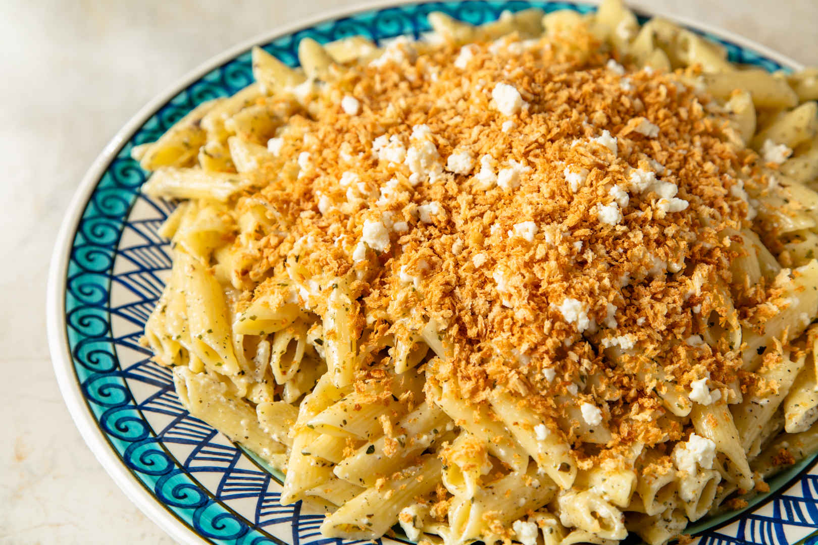 Hazır olan makarnayı servis tabağına alın ve tavada kavurduğunuz ekmek kırıntısını serpiştirip servis edin.