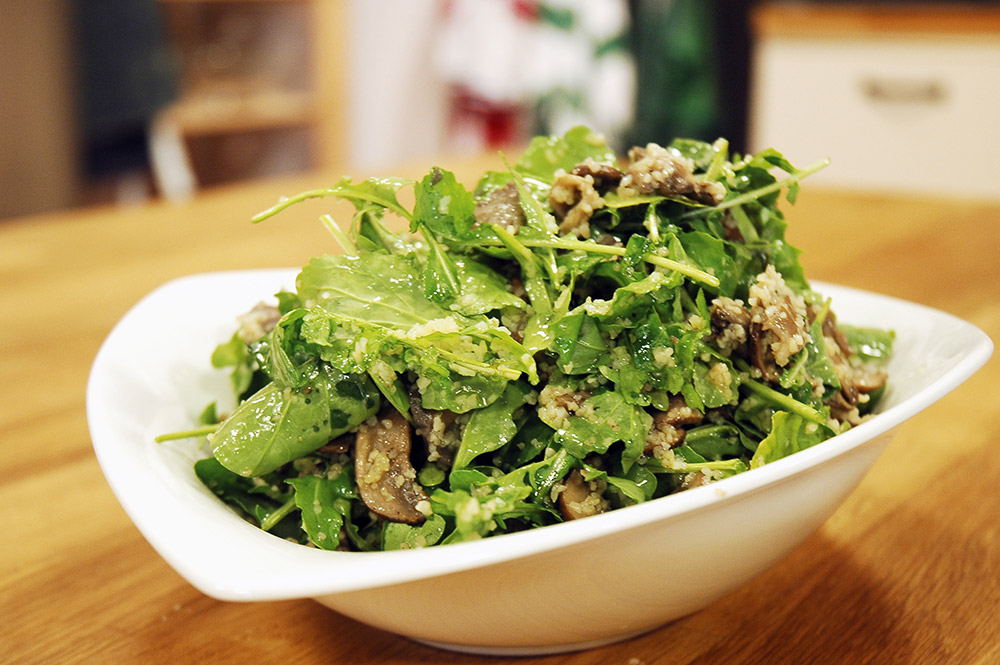 Büyük bir kaseye roka, sotelenmiş mantarlar ve ince bulguru alın ve iyice karıştırın.