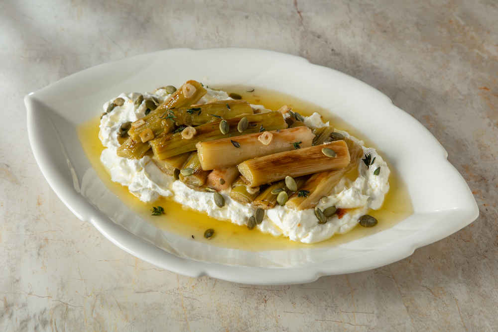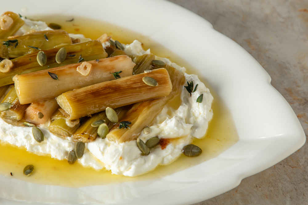 Yoğurdun üzerine pırasaları dikkatli bir şekilde dizin.