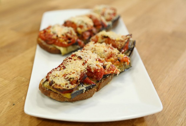 Ekmeklerin üzerine keçi peyniri sürün. patlıcan dilimlerini yerleştirin. Zeytinli harçtan sürün, domatesleri yerleştirin. Son olarak üzerine parmesan serpin ve fırında üzerleri kızarıncaya kadar pişirin.