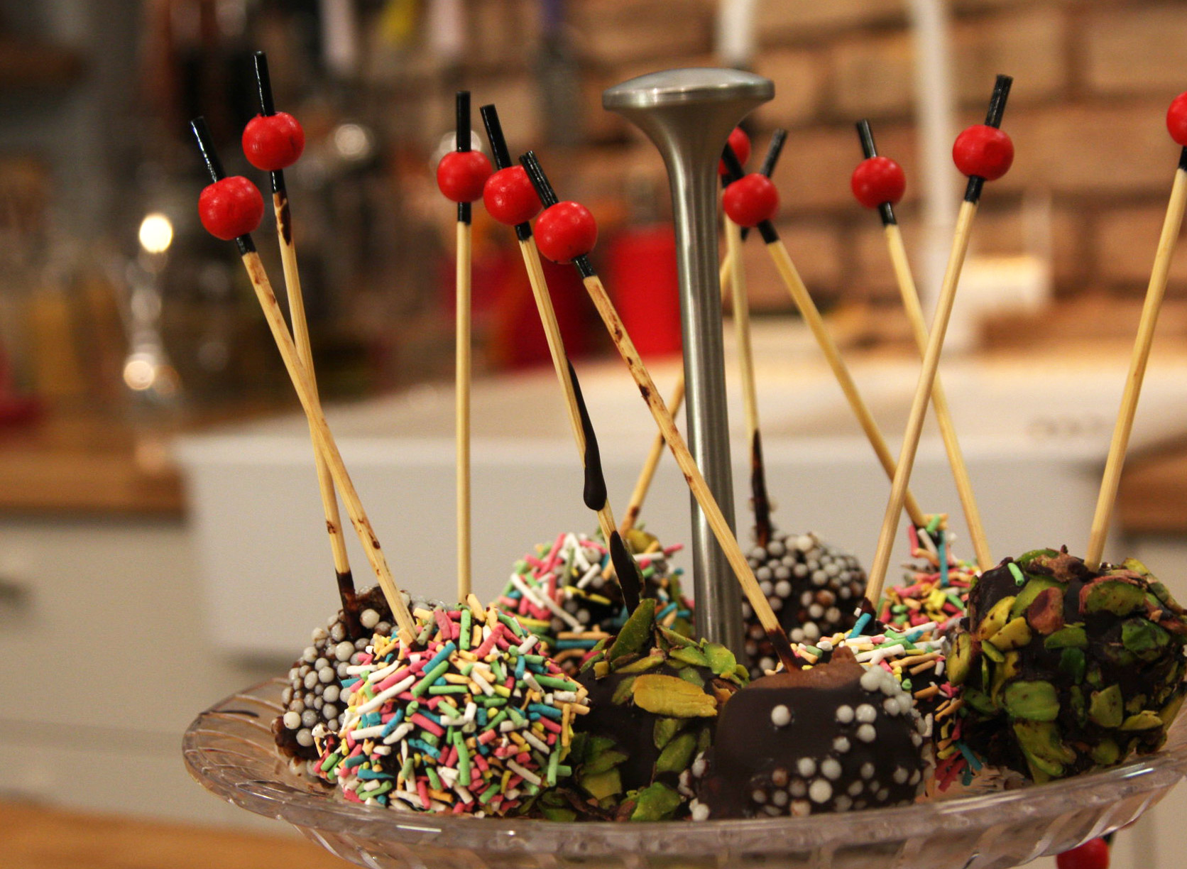 Buzdolabında bekleyen topları çıkarın. Çubuklarından tutarak erimiş çikolataya batırın ve her tarafının bulanmasını sağlayın.