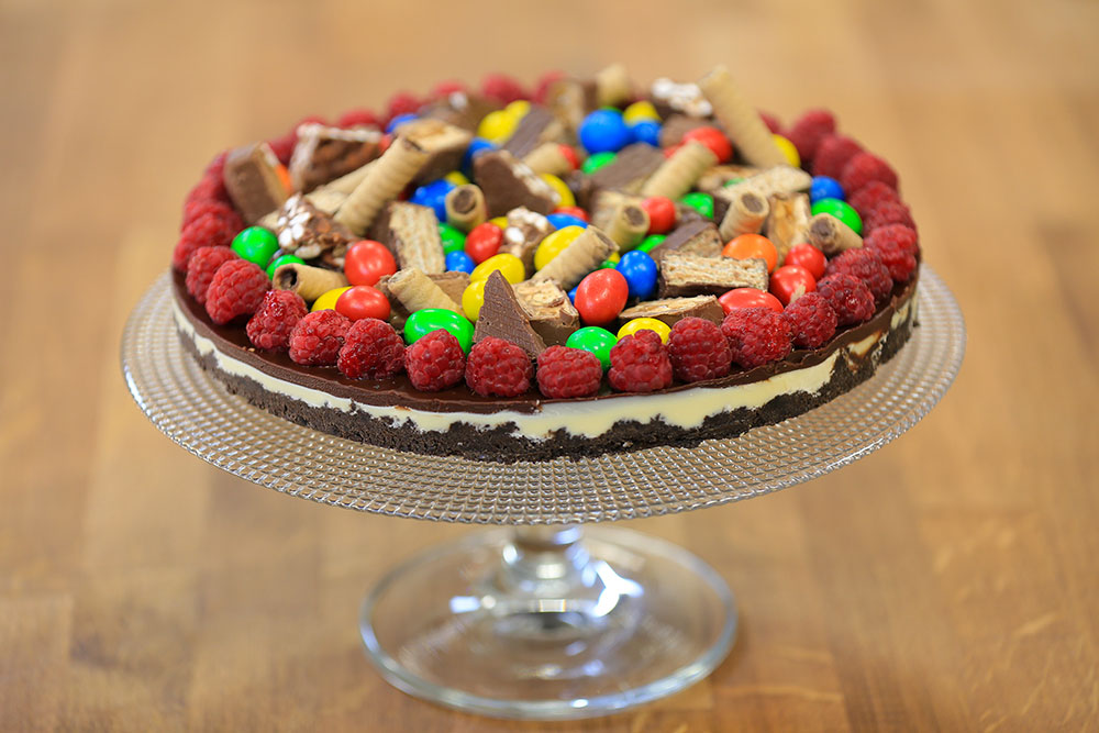 Tartınızı buzluktan çıkartıp erimiş çikolatayı üzerine döküp beyaz çikolatayı tamamen kaplayın ve tekrar üzerini kapatıp dolaba kaldırın 15-20 dakika sonra üzerini meyve ve istediğiniz şekerlemelerle süsleyip servis edin.