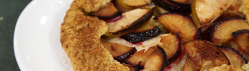 Hamuru buzluktan çıkartın ve yemek tabağı genişliğinde merdane yardımıyla açın. Orta kısmına elmaları ve erikleri yerleştirin. Hamurun kenarlarnı dikkatlice elmaların hafif üzerine gelecek şekilde katlayın.