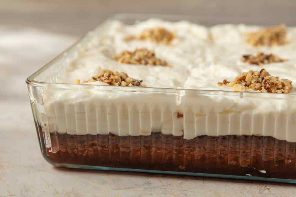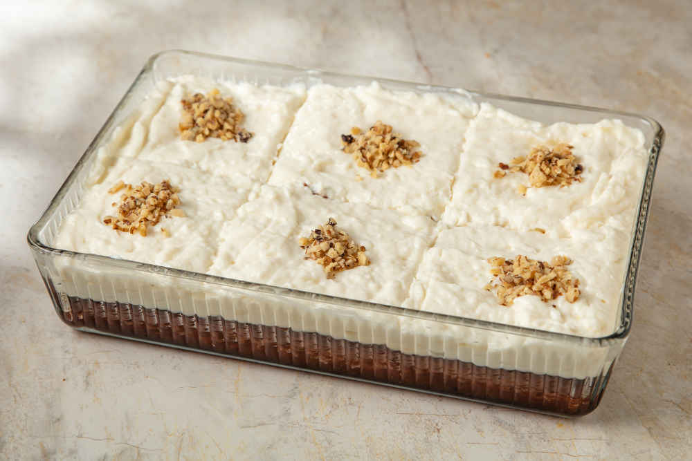 Üzerine hindistan cevizi ve ceviz serpip dilimleyerek servis edin.