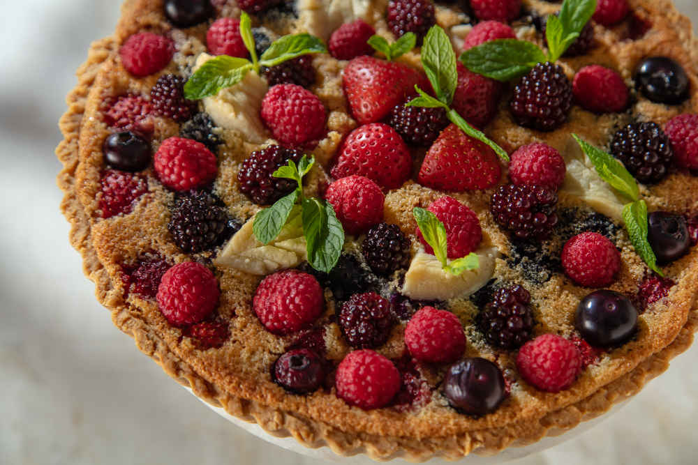 Fırından çıkan tartın üzerini meyvelerle süsleyin ve 180 derecede önceden ısıtılmış fırında 5 dakika daha pişirin.