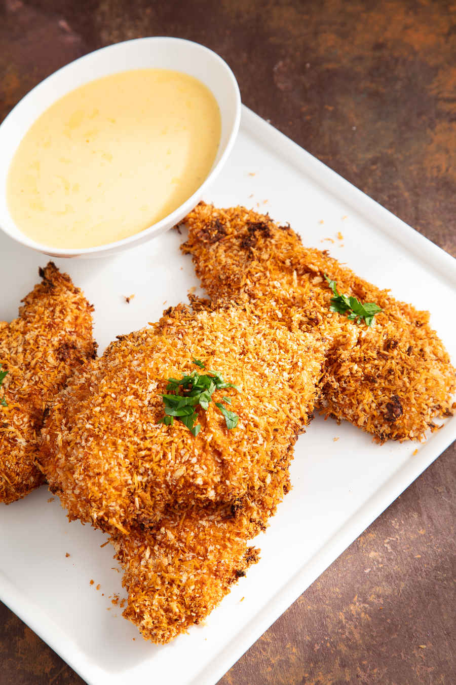 Büyük ve dikdörtgen bir kapta panko, ezilmiş sarımsak, rendenin ince tarafıyla rendelenmiş parmesan, toz kırmızı biber, tuz ve karabiberi ilave edip karıştırın.